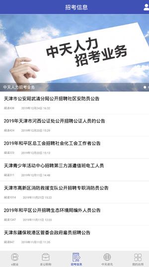 1、在本站下载安装中天人力app,运行软件,可以看到有e就业、非公职称、招考信息、中天咨询、我的应用五个板块;
