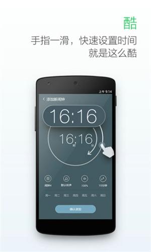 1、采用手指滑动式设置闹钟,抛弃了传统的数字输入方式,操作更加简单有趣;
