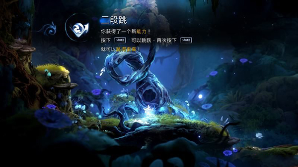 上到左边后一路走到尽头,你会发现一颗新的精灵树,与其互动可以获得二段跳。