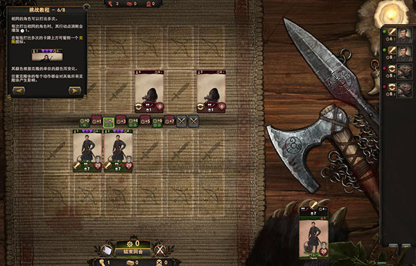 ②战斗界面如下,右下角是我们可用的卡牌,上面显示了该卡牌的战斗方式、速度和放置位置,同时有护甲血量和耗费的行动点数。左侧为战斗场地,上方为敌人战场下方为友军战场玩家需要将卡牌放置到需要位置。中间为回合指示器,绿色为我方行动回合,同时标注了给予的行动点数,未使用的行动点数将顺延到下一个回合,在最后的准备回合结束后就会开始战斗回合,战斗结束后双方都还存在战力时将再次进入准备回合。