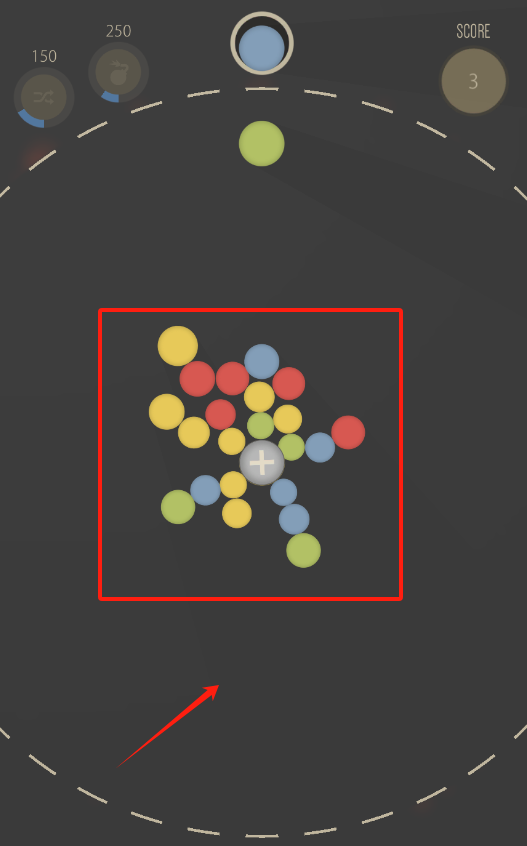 3、将带有加号的灰色球体精准弹射,撞击同色小球即可得分。注意预判运动轨迹,合理利用物理反弹效果提高命中率。