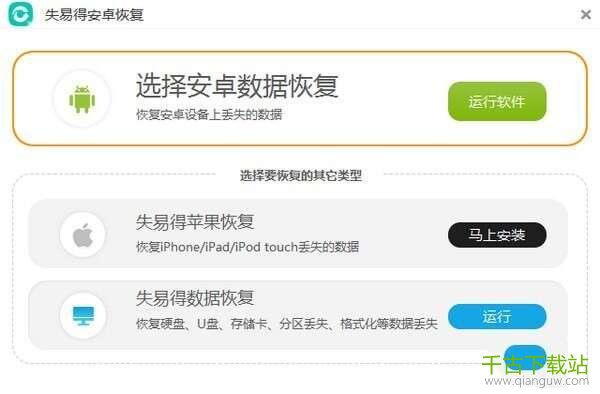 失易得安卓恢复软件是一款十分出色的恢复软件,界面美观大方,功能强劲实用,可以恢复安卓手机数据,能够恢复手机联系人,手机中的音乐,照片,记录,视频,QQ,微信等等。支持多品牌的安卓手机。