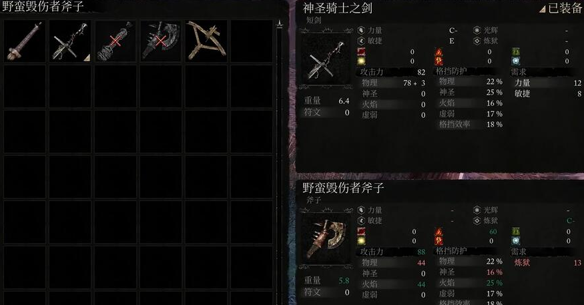 4、野蛮毁伤者斧子在数值上比神圣骑士之剑要更好些,不过选择使用哪把武器还是看玩家的偏向。